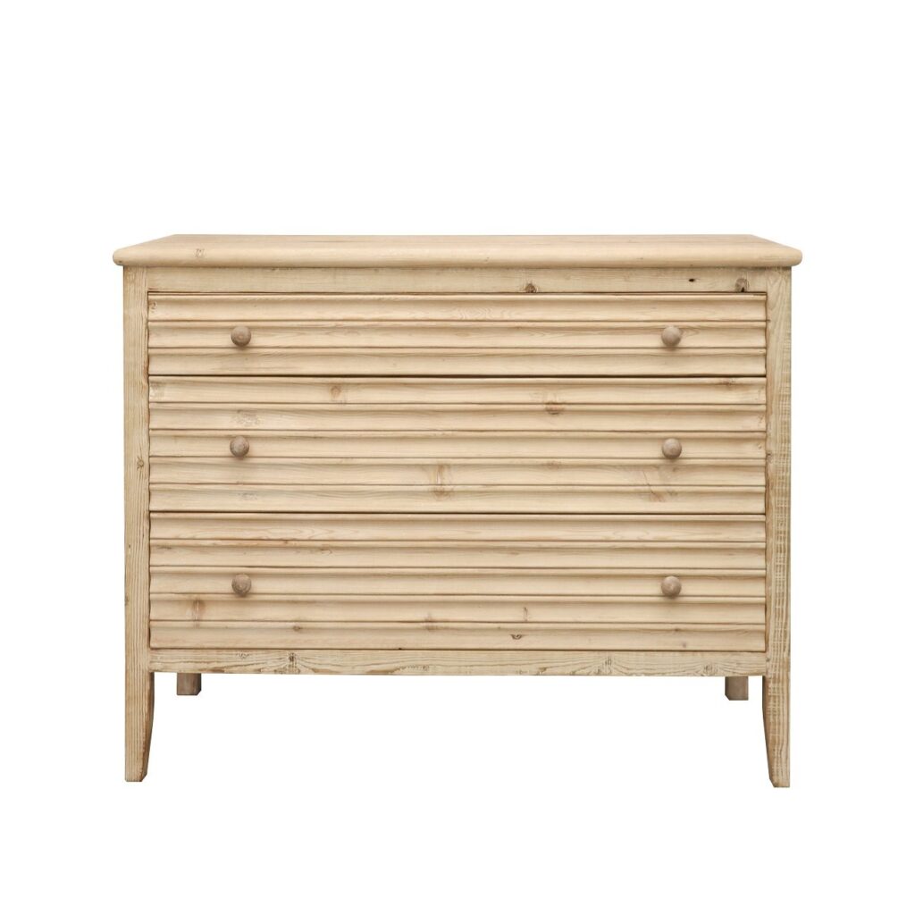 An elegant classic the Marcos chest of drawers features three drawers elevated on slender tapered legs. Featuring scalloped drawer fronts and small refined pull handles creating a unique piece.